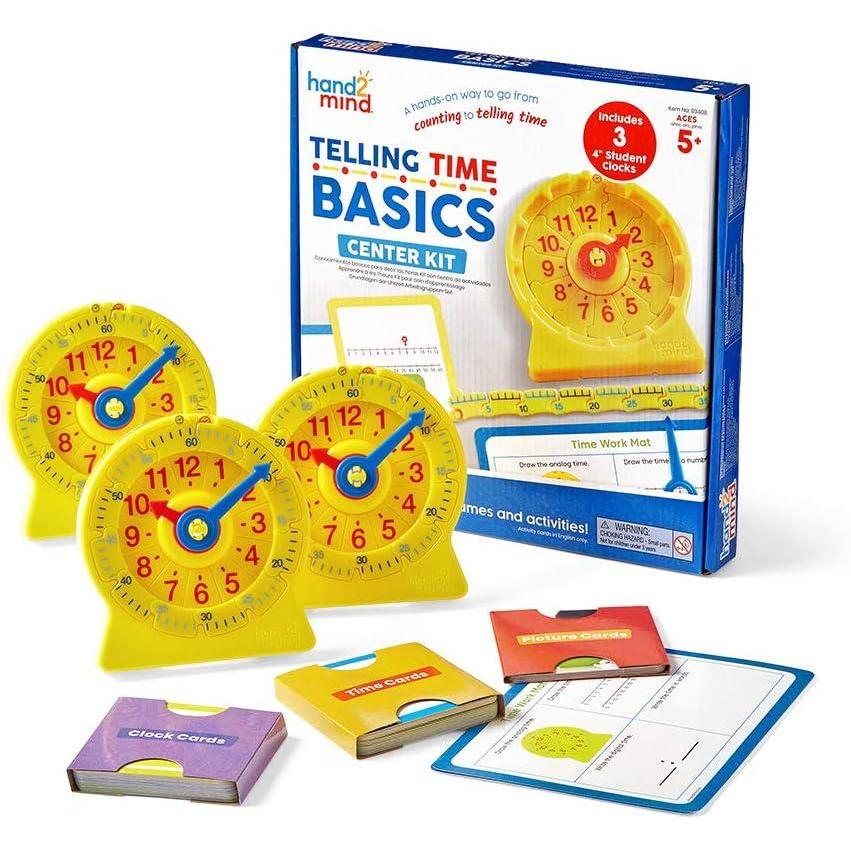 Hand2Mind Telling Time Basics Center Kit – Learn to Tell Time Activity Set with Analog Classroom Clock for Kids, Yellow